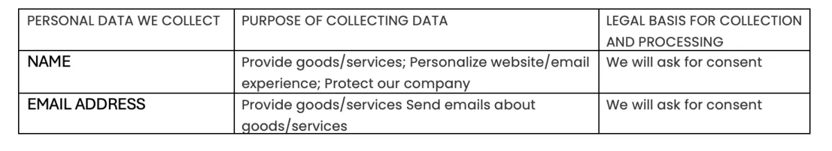 3.3 Legitimate Interest: We claim a legitimate interest for processing your personal information when you submit the information with an expectation that it will be processed without any impact on you. If you have questions about your data, what we use it for, or the basis for us collecting it, please contact us at [[email protected]].
